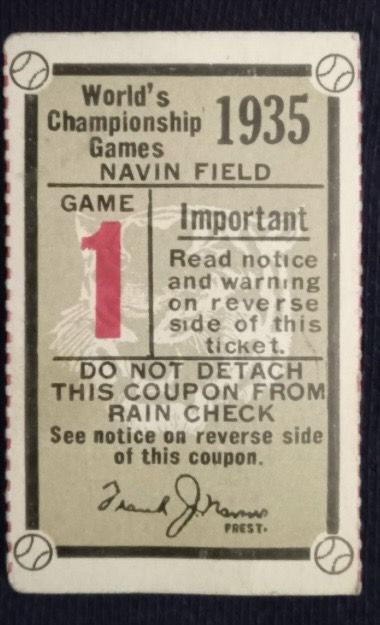 and some other one of kind Babe Ruth items; 1935 World Series Rainy Day Ticket Stub, Game #1 the Detroit Tigers vs the Chicago Cubs the Chicago Cubs won (3 to 0). Really nice piece of Baseball History. +(HANOVER TWP.) $400.00 OBO