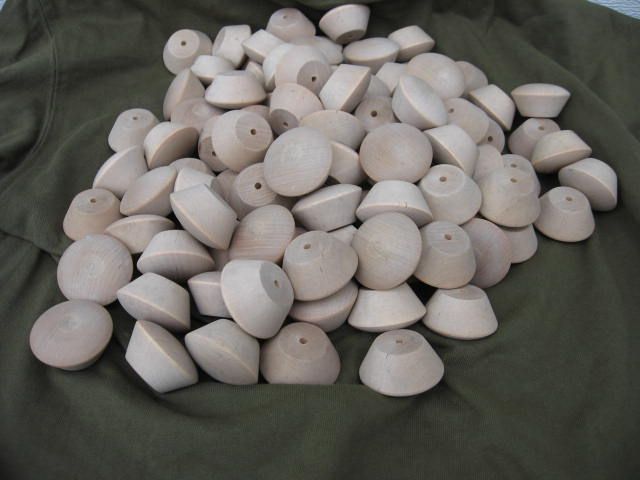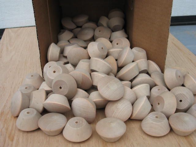 100 total, NOS, made from tight face-grained hardwood maple, fully sanded, unfinished, and pre-drilled to 1/8” in order accept a screw, measure 1½-inches at the big end and taper to 7/8-inches at the small end, project 7/8-inch from the face of drawer. +(CLARKS SUMMIT)