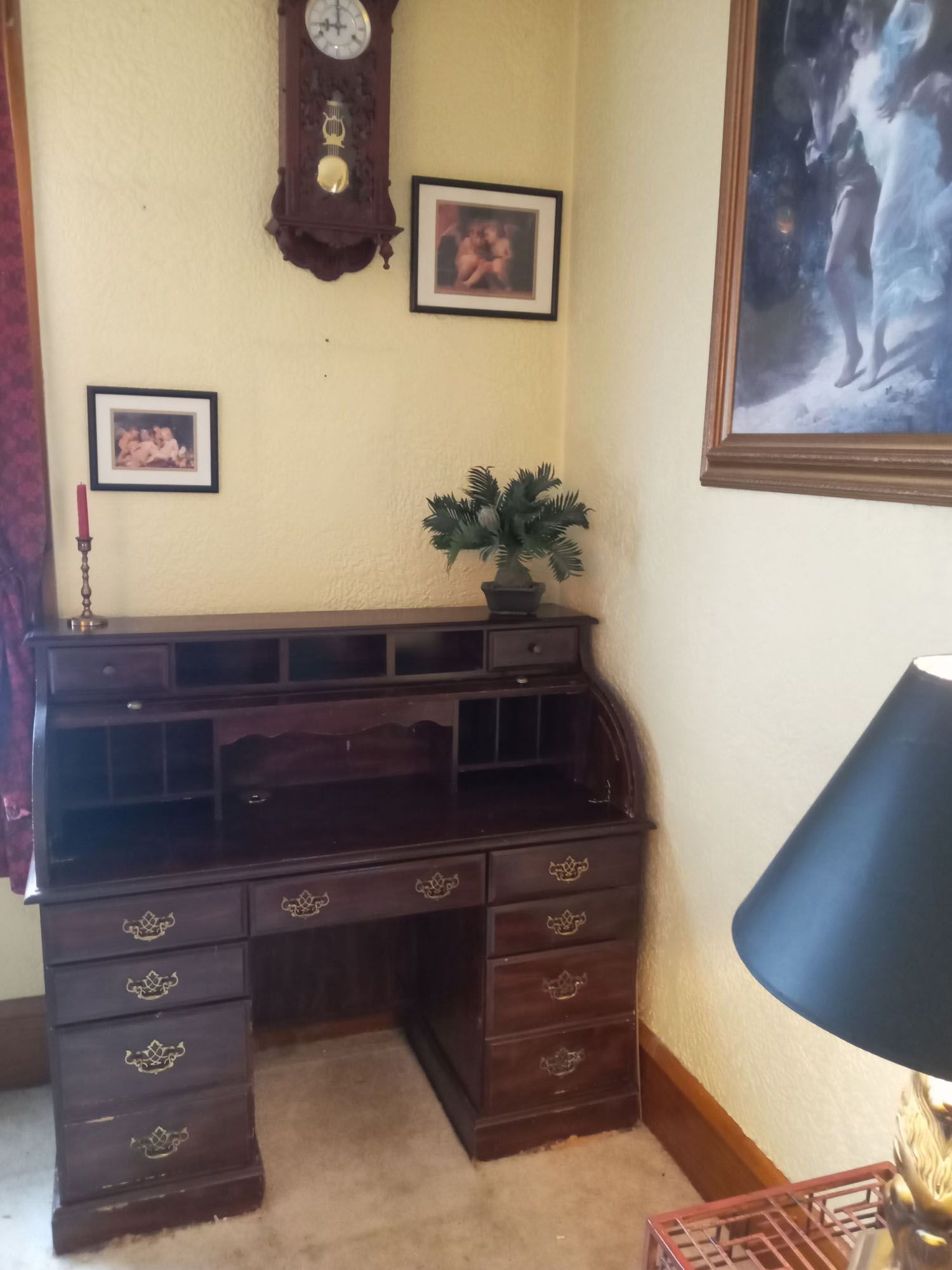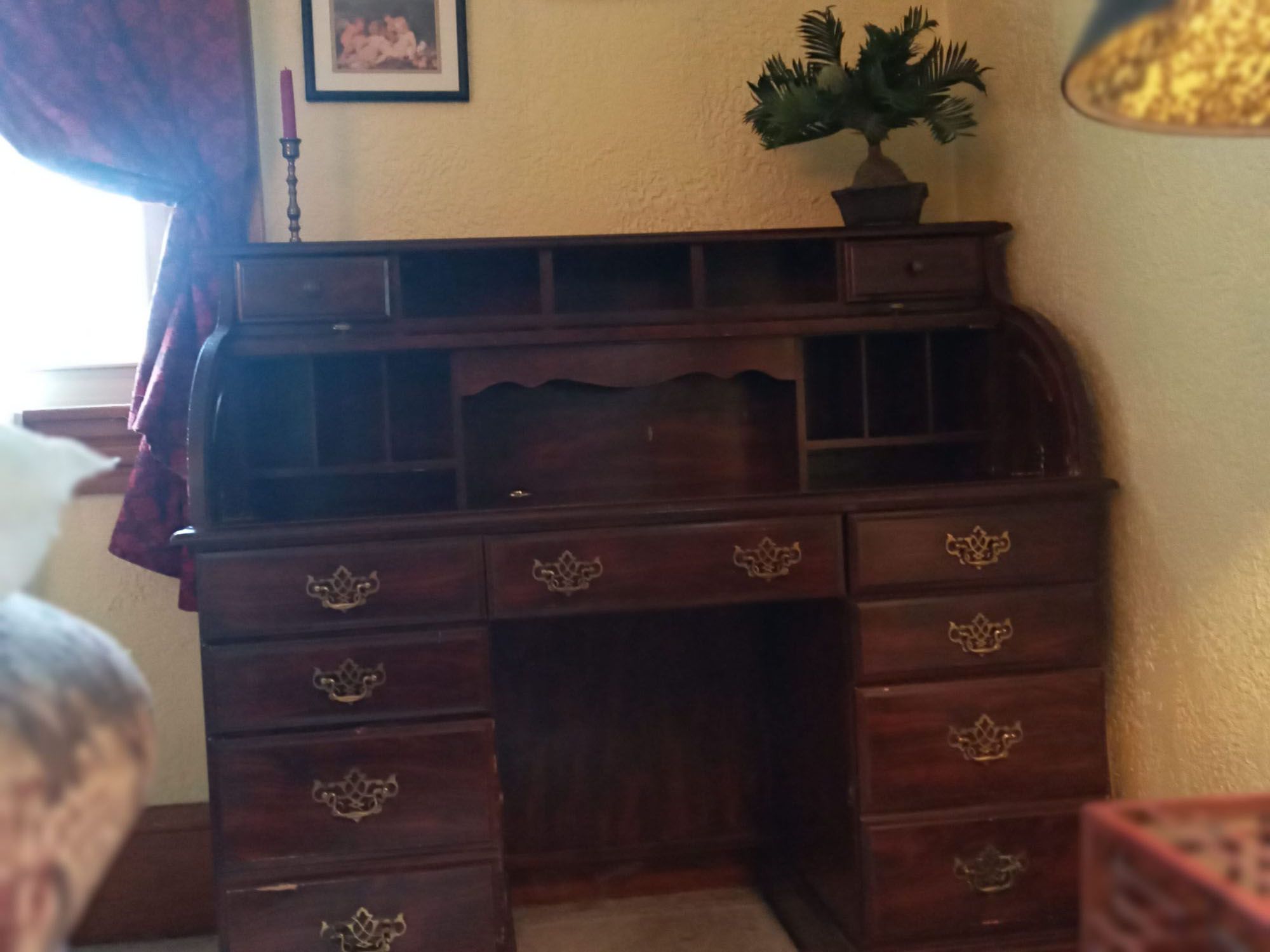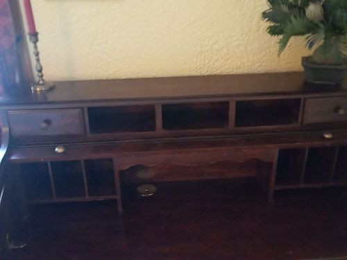 with file drawers, brass hardware, still beautiful after 30 years, slight damage at bottom, must sell, moving out of state. +(EDWARDSVILLE) Neg.