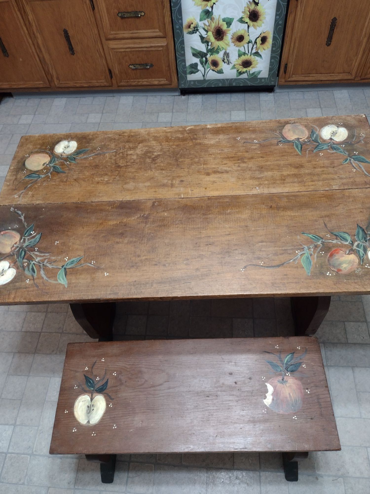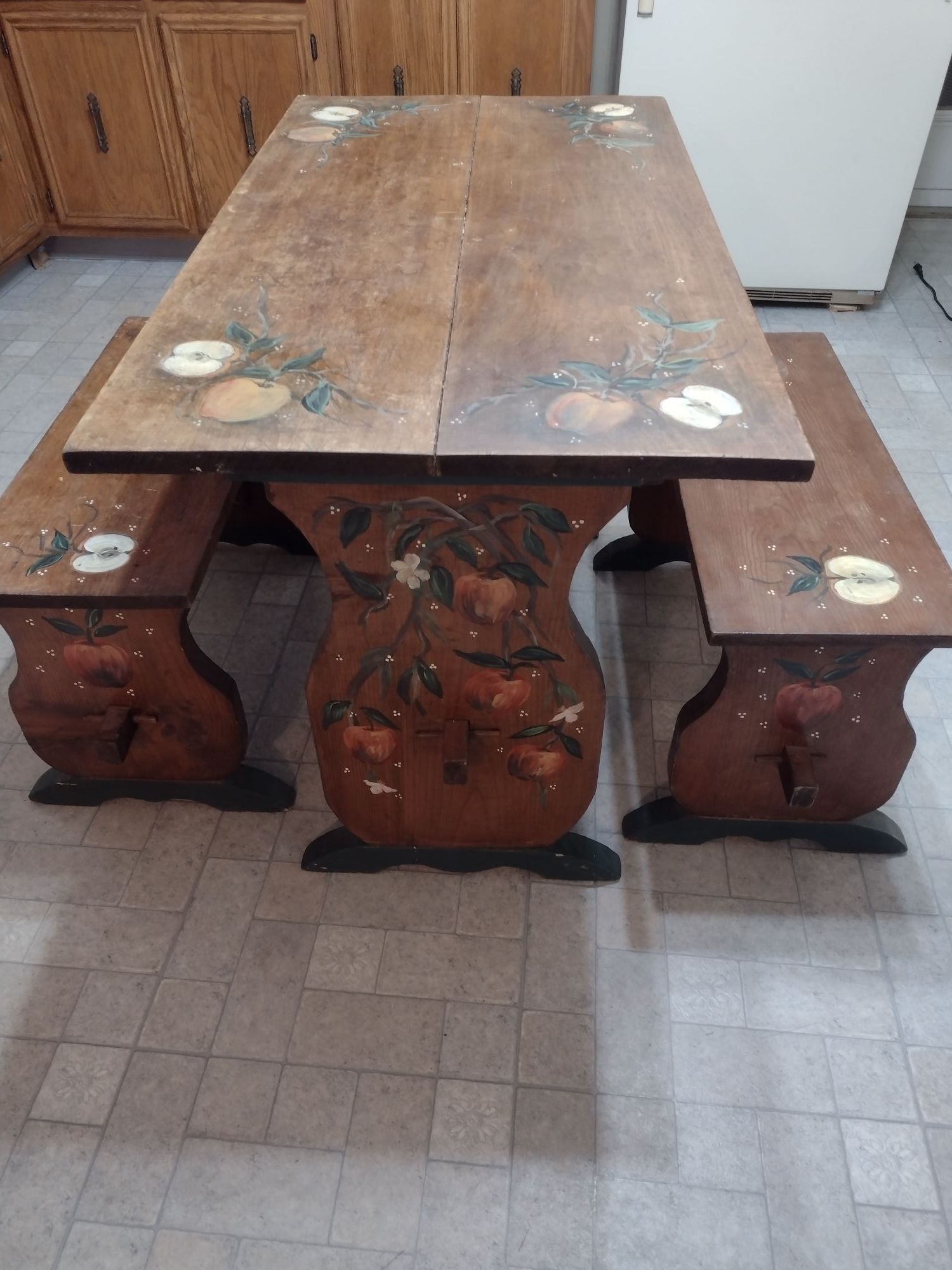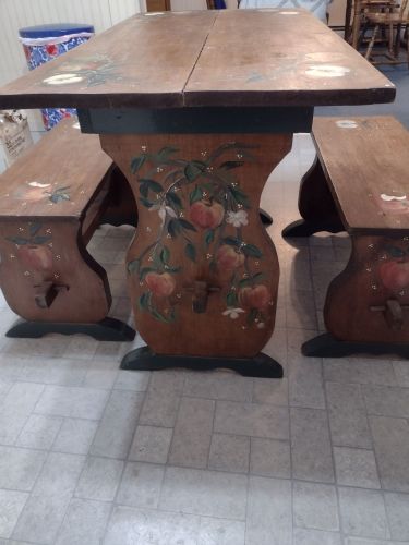 Rustic. hand painted, ideal for cozy kitchen or dining spot, table 42"x 23"x 30", benches 29"L.x 17"H. +(BLAKESLEE)