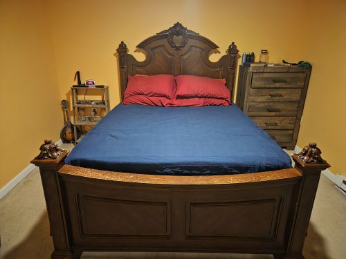 Divorce sale, ornate headboard good condition, foot board scratched from pets, overall sturdy and solid piece, paid $2000., serious inquiries only +(MADISON TOWNSHIP) $450.00 FIRM