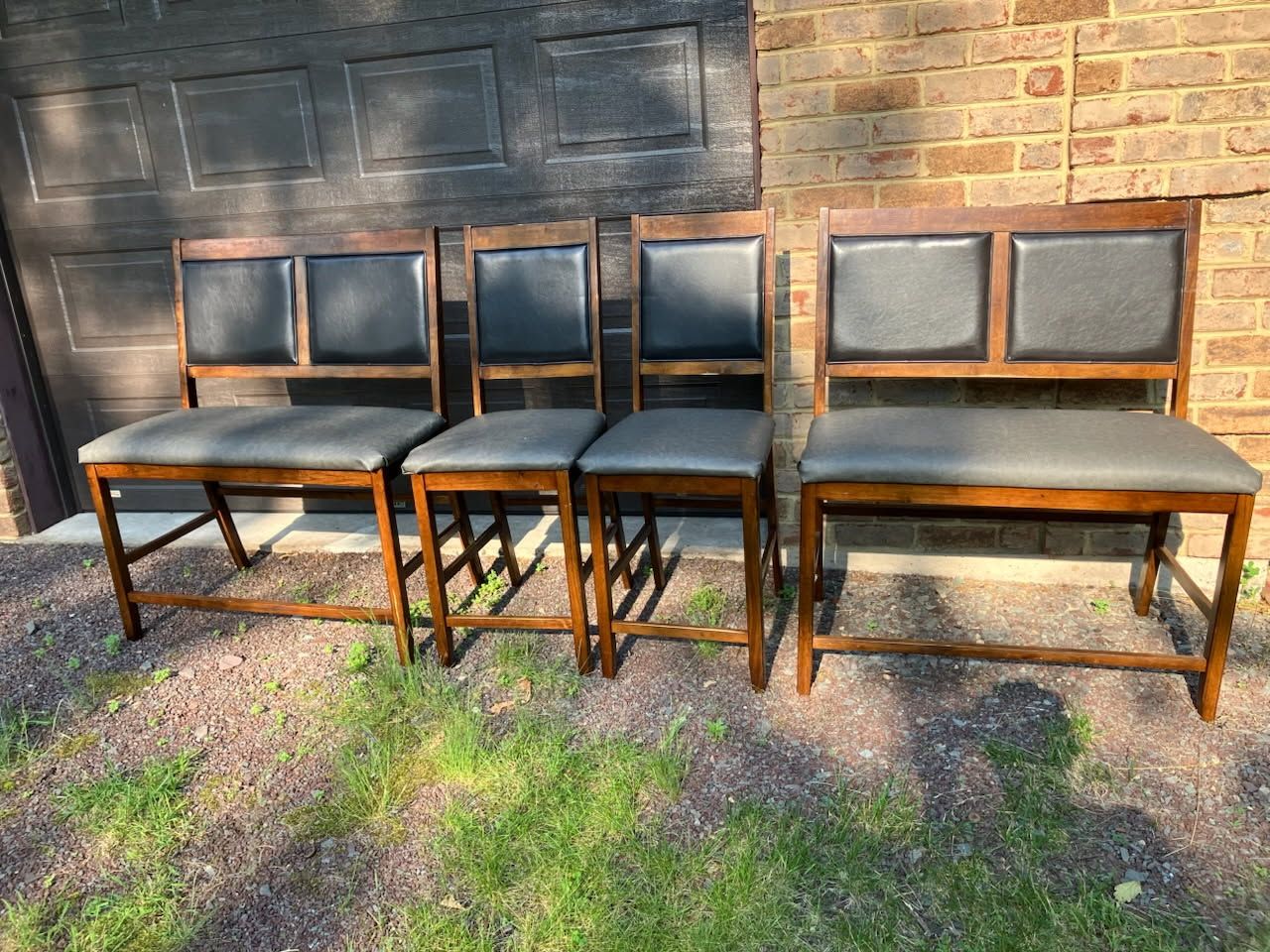brown, 48"x 48", with 2-36"W.x 24"H. leather bench chairs & 2-leather chairs, 18"W.x 24"H., sits 6 people, +(OLD FORGE)