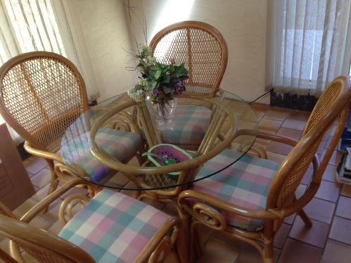 includes 42" glass top table, 4-highbacked armed cushioned chairs, coffee table, w/centerpiece, new over $2000.00, ideal for kitchen/ den/ porch. +(OLD FORGE)